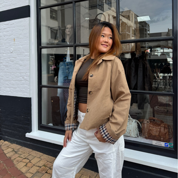Oversized short trench with notched collar, plaid lining, side pockets, button closure.