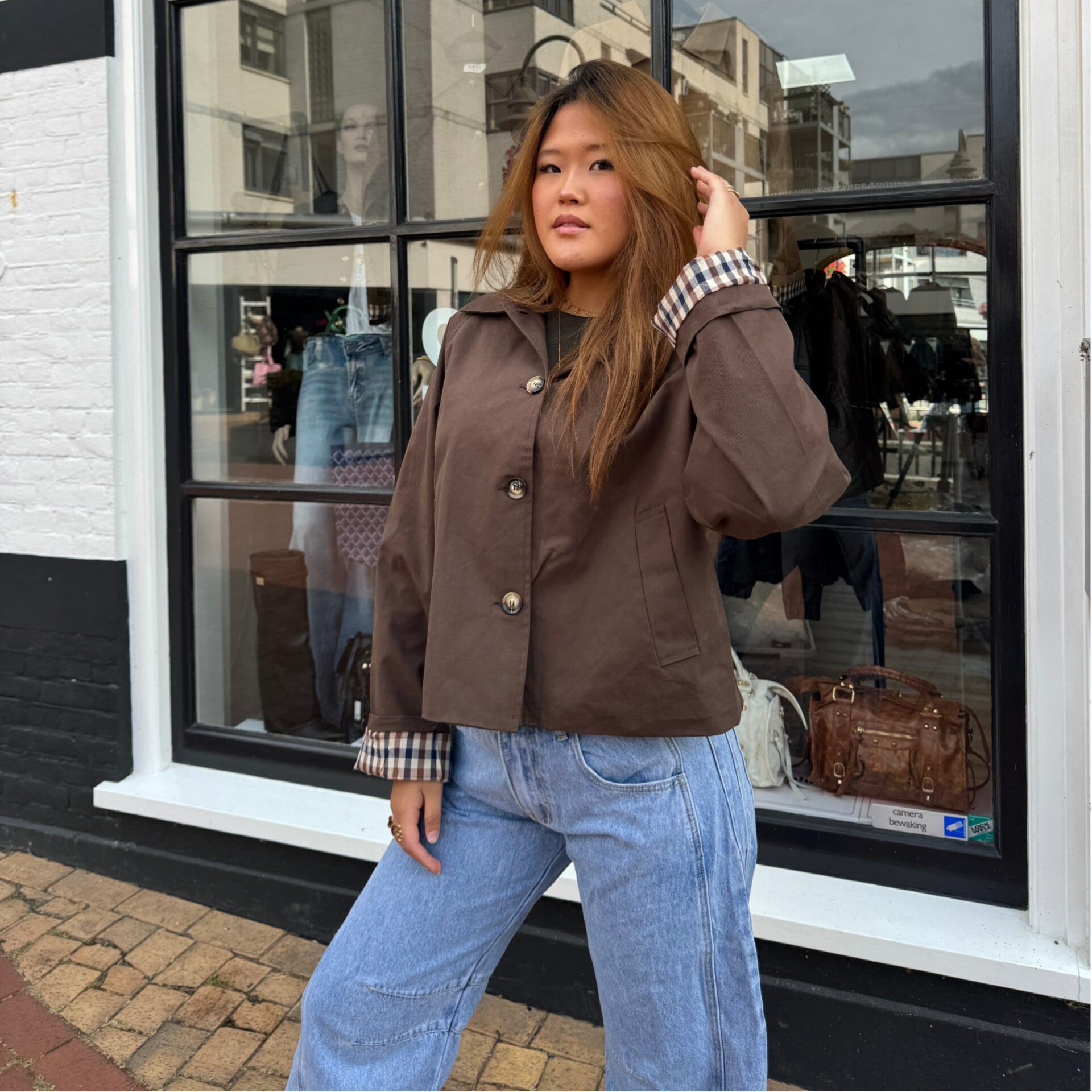 Oversized short trench with notched collar, plaid lining, side pockets, button closure.