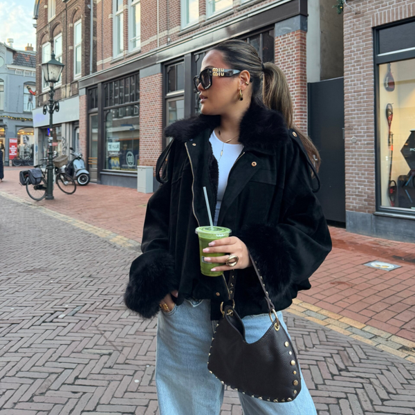 Rosie suédine bomberjack met afneembare faux fur details, verborgen zijzakken en een warme faux fur voering. Comfortabel, stylish en perfect voor koude dagen.